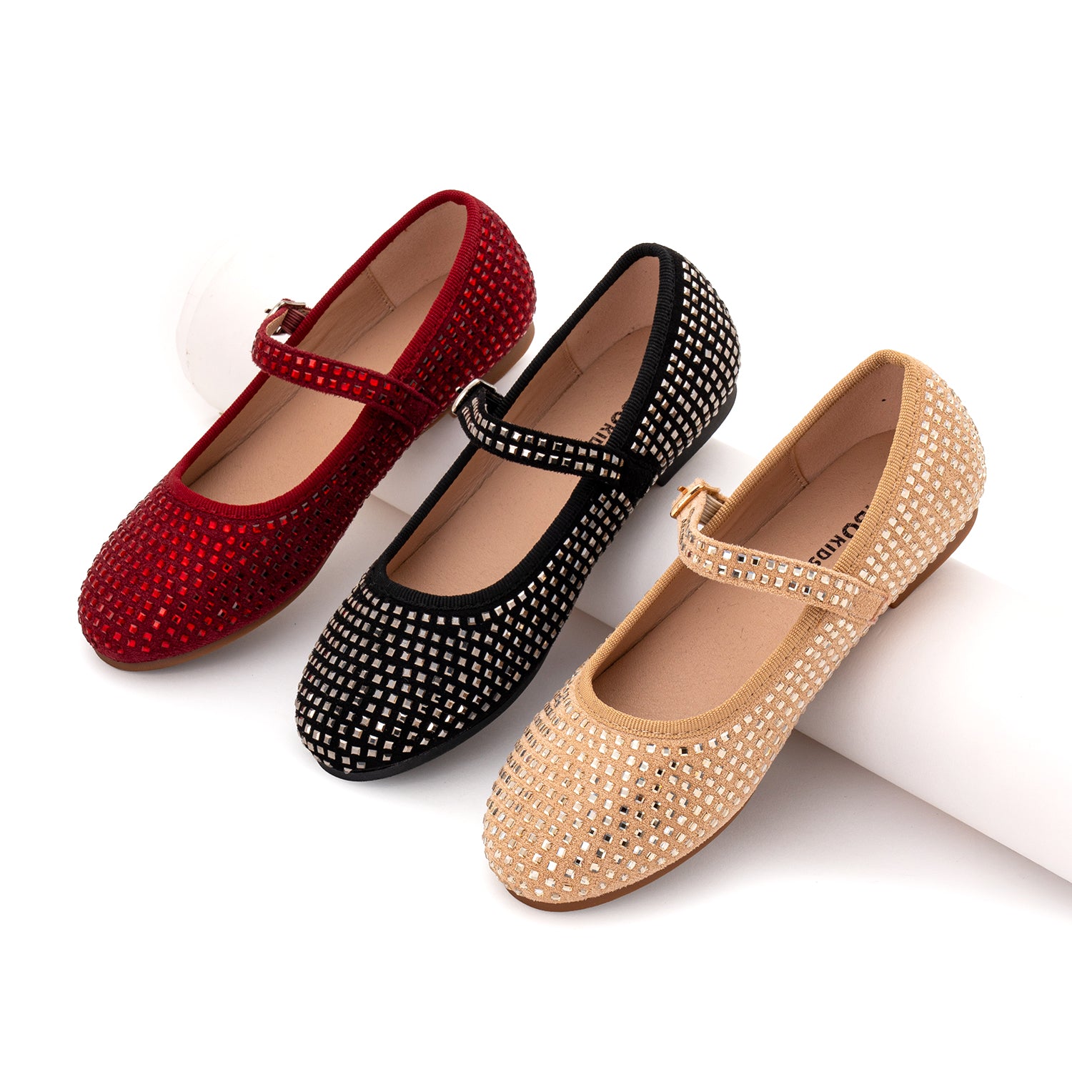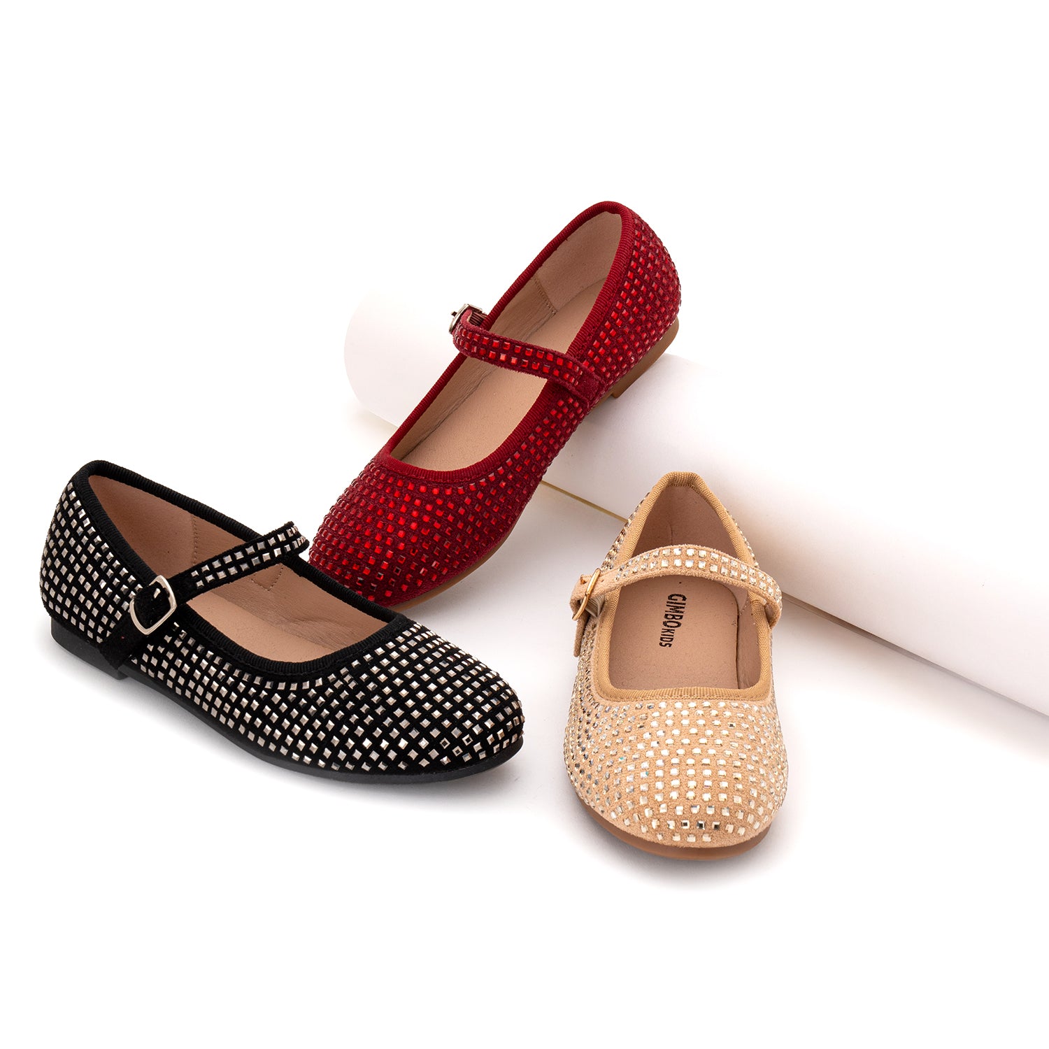 Su diseño en gamuza sintética con apliques brillantes la convierte en una opción ideal para niñas que quieren destacar en eventos especiales o celebraciones.