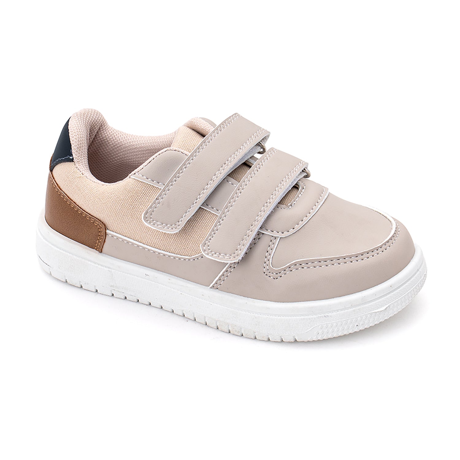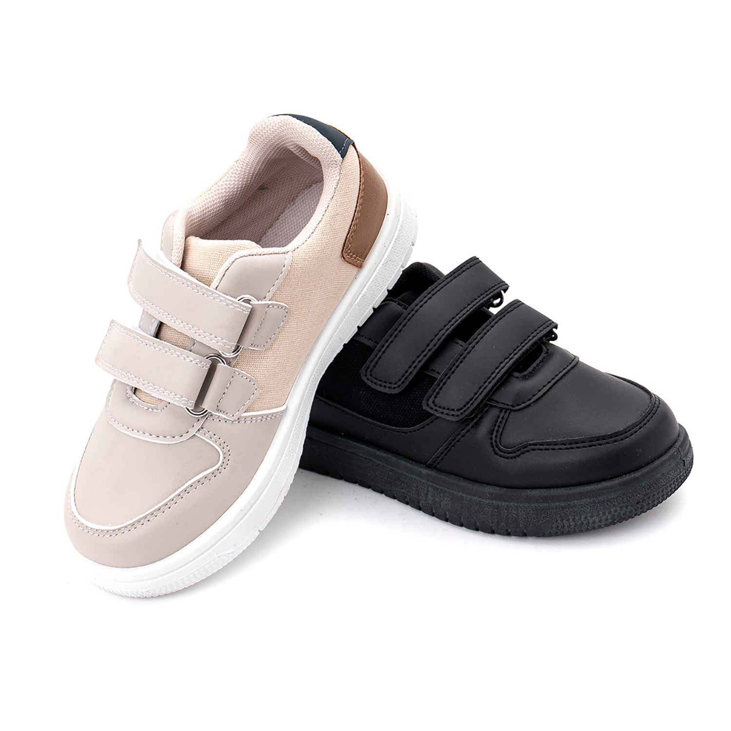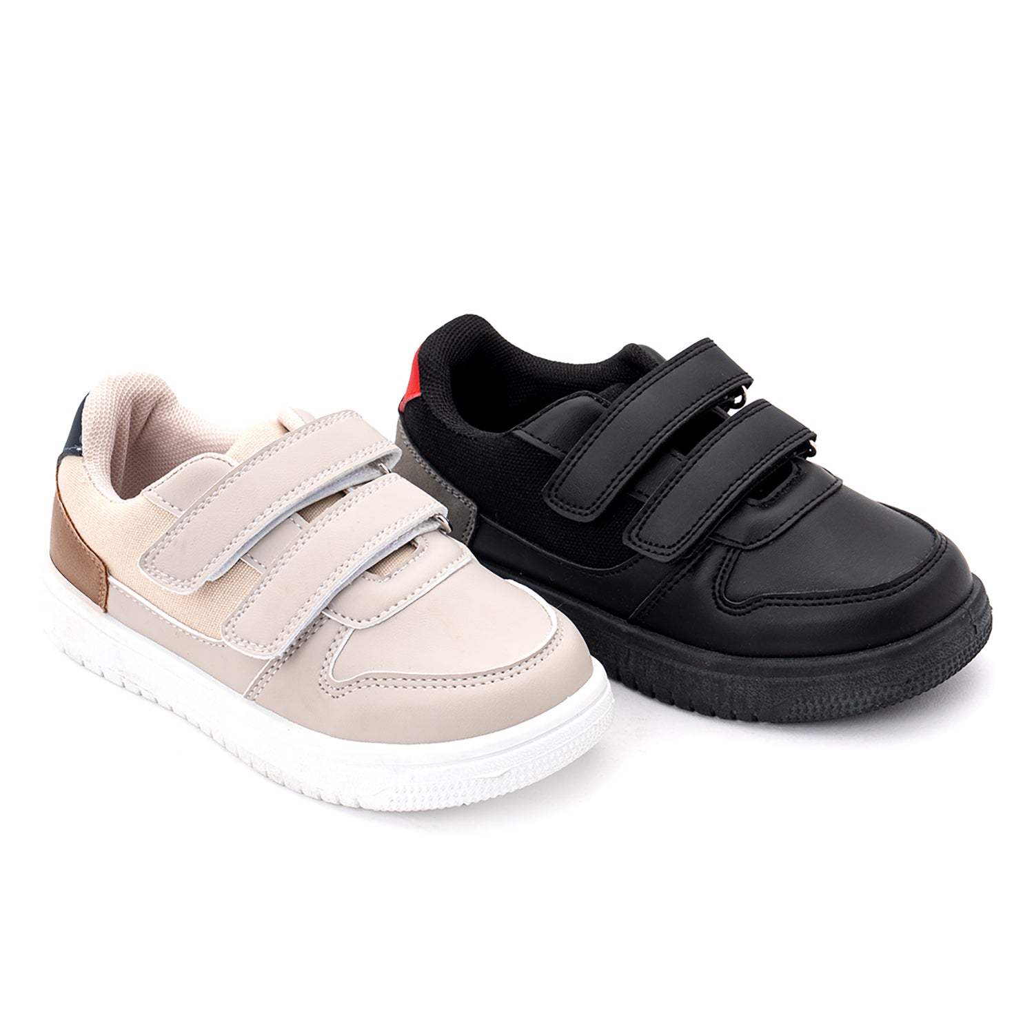 La suela antideslizante ofrece estabilidad al caminar y jugar, mientras que el interior acolchado brinda confort durante todo el día. Disponible en dos combinaciones modernas: beige con detalles camel y azul marino, o totalmente negro con toques grises y rojos.